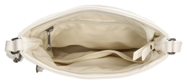 Promyšlené vnitřní uspořádání vám usnadní organizaci. Hlavní kapsa na zip bezpečně uschová všechny vaše cennosti, jako je peněženka, mobilní telefon a klíče. Pro drobnosti, které chcete mít okamžitě k dispozici, skvěle poslouží samostatná přední a zadní kapsa, rovněž uzavíratelné na zip. Kvalitní imitace kůže v čistě bílém provedení dodává kabelce luxusní vzhled a je příjemná na dotek. Kovové doplňky v odstínu gun metal podtrhují její moderní charakter.