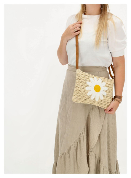 Kabelka na první pohled zaujme svým okouzlujícím proutěným vzhledem, který evokuje atmosféru prázdnin u moře. Přírodní odstín se snadno kombinuje s letními šaty i ležérním outfitem. Originálním detailem je roztomilá látková sedmikráska na přední straně, která podtrhuje její hravý charakter a dodává celému modelu nezaměnitelný šarm. Tento kousek není jen taška, je to stylové vyjádření letní nálady.