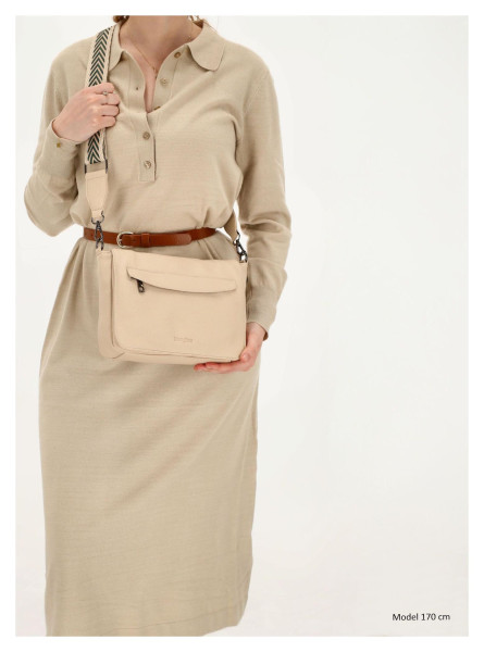 Kabelka je vyrobena z kvalitní a na pohled přitažlivé imitace kůže v nadčasové béžové barvě, která je nenáročná na údržbu. Celkový vzhled podtrhuje elegantní překlopka a originální široký ramenní popruh s potiskem, který dodává modelu jedinečný charakter. Kovové detaily v odstínu gun metal pak celému designu propůjčují punc decentního luxusu.