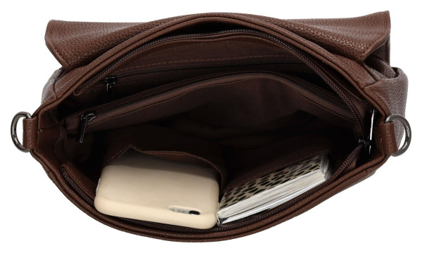 Pod elegantní překlopkou se ukrývá dokonale organizovaný vnitřní prostor. Hlavní komora je prakticky rozdělena kapsou na zip, doplňují ji další menší kapsičky pro snadné uložení telefonu, klíčů nebo peněženky. Další kapsy na zip na přední i zadní straně kabelky poskytují bezpečné místo pro věci, které potřebujete mít neustále po ruce. Díky tomuto uspořádání budete mít ve všem vždy perfektní přehled.