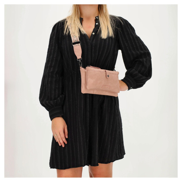 Jemný světle růžový odstín doplňuje stylový barevný popruh, který z kabelky dělá nepřehlédnutelný módní doplněk. Kovové detaily v odstínu gun metal dodávají celkovému vzhledu moderní šmrnc. Lehký a odolný materiál z kombinace nylonu a polyesteru zaručuje, že vám taška bude dělat radost po dlouhou dobu. Je to ideální volba, když chcete svému outfitu dodat špetku barvy a osobitosti.