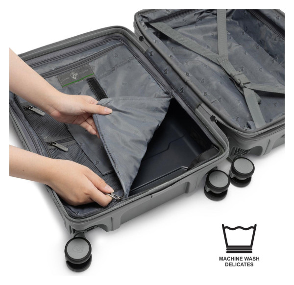 Skořepina tohoto kufru je vyrobena výhradně z recyklovaných PET lahví, přeměňuje odpad v odolného a spolehlivého partnera na cesty. Pevná konstrukce s elegantním matným povrchem je doplněna o ochranné kovové rohy. Vaše věci tak zůstanou v bezpečí i při náročnější manipulaci na letištích. Tento cestovní kufr je navržen, aby vydržel a zároveň vypadal skvěle.