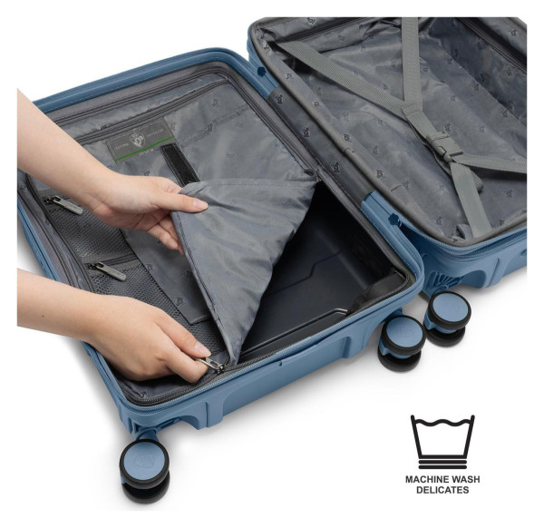 Uvnitř vás čeká dokonale organizovaný prostor. Unikátní podšívka, rovněž z recyklovaného materiálu, je plně vyjímatelná a pratelná. Snadno tak udržíte interiér kufru vždy svěží a čistý. Díky praktické dělicí přepážce a kompresním popruhům zůstane vše na svém místě. Potřebujete více místa na suvenýry? Integrovaný expandér vám poskytne další úložný prostor. Tichá otočná kolečka a lehká teleskopická rukojeť zajistí naprosto hladký pohyb na jakémkoli povrchu.